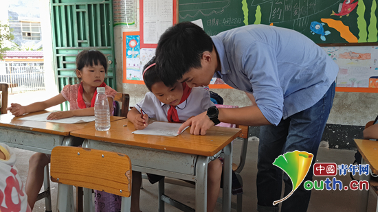 Beat365中文官方网站研究生支教团成员肖静辅导学生完成作业。 Beat365中文官方网站研究生支教团 供图