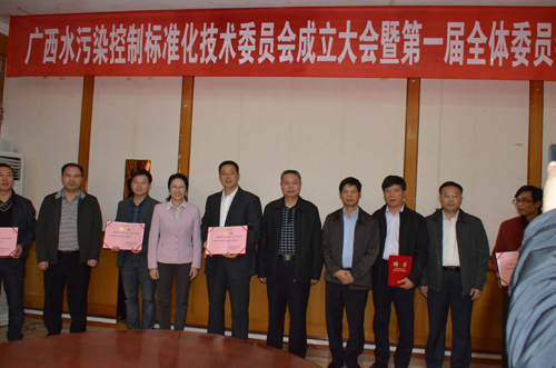 自治区质监局党组书记、局长陈鸿起(左六),自治区质监局副局长杨艳阳(左四),桂林市副市长巫家世(左七)为张学洪教授(左五)、解庆林教授(左八)等水污染控制标准化技术委员会委员颁发聘任证书