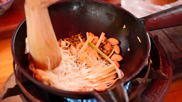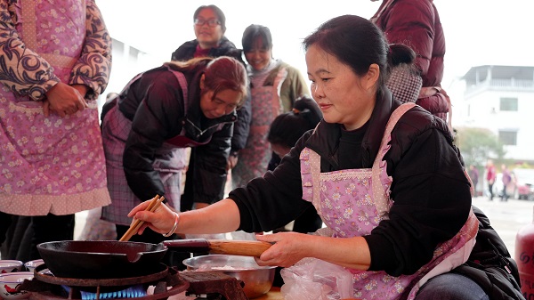 “茶嘎奶奶茶嘎婆,端起瓶子话头多;一日三餐打油茶,没得油茶睡不着。”这首在顺溪村广为流传的民谣,道出了村民们对油茶的深厚情感。比赛现场,来自各屯的“茶嘎奶奶”和巧手媳妇们纷纷亮出绝活,从炒制、捶打到熬煮、调配,一招一式尽显传统技艺的精髓。铁锅翻炒的沙沙声、木槌敲击的清脆声此起彼伏,鲜茶叶、老姜、大蒜、绿豆在巧手中交融升华,一碗碗色泽金黄、香气四溢的灌阳油茶接连出锅,引得现场观众频频点赞。