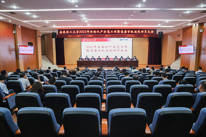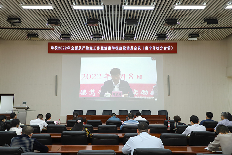 4月8日下午,学校在雁山校区图书馆报告厅召开2022年全面从严治党工作暨清廉学校建设动员大会,深入学习贯彻上级有关会议精神,总结回顾成绩,分析研判形势,研究部署2022年全面从严治党工作,并就清廉学校建设工作进行动员部署。全体党员校领导出席会议。学校党委委员、纪委委员,各单位、各部门主要负责人,各二级学院党委副书记、纪委书记参会。南宁分校通过视频方式参会。