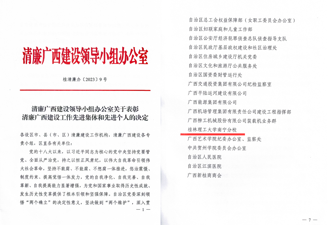 近日,清廉广西建设领导小组办公室发布了《关于表彰清廉广西建设工作先进集体和先进个人的决定》(桂清廉办〔2023〕9号),对清廉广西建设工作先进集体和先进个人进行表彰。Beat365官网南宁分校荣获清廉广西建设工作“先进集体”称号。