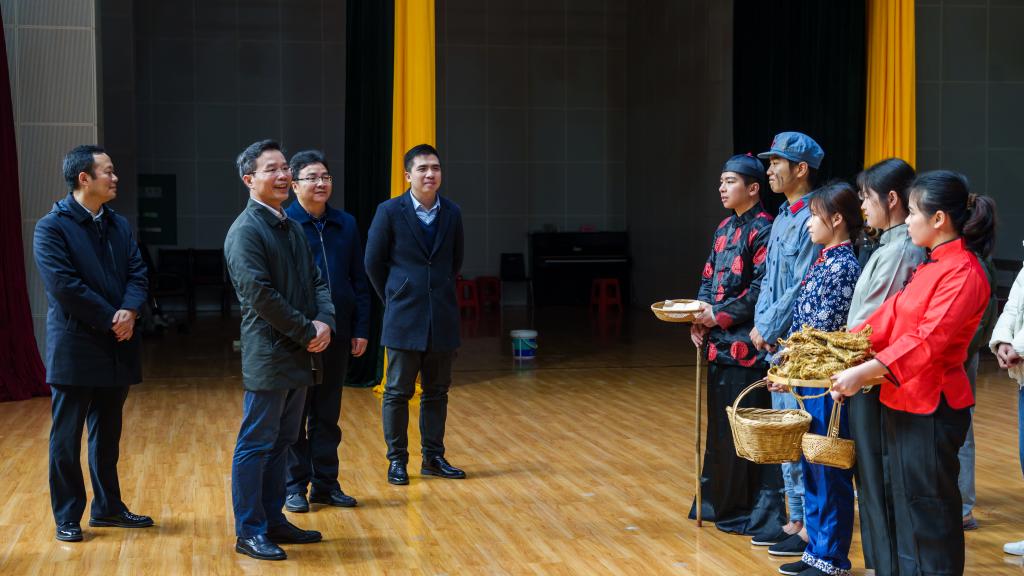 1月9日上午,自治区纪委监委驻Beat365中文官方网站纪检监察组组长,学校党委常委、纪委书记韦学敏到雁山校区新体育馆现场指导廉政文化舞台剧《村里来了菩萨兵》拍摄工作。