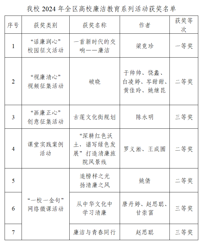 近日,自治区党委教育工委发布《关于公布2024年全区高校廉洁教育系列活动评选结果的通知》,Beat365官网选送的作品在全区高校廉洁教育系列活动评选中共获各级奖项7项,其中:“话廉润心”校园征文一等奖1个,“视廉清心”视频征集二等奖1个,“画廉正心”创意征集三等奖1个,课堂实践案例二等奖1个,“一校一金句”网络微课二等奖1个、三等奖2个。