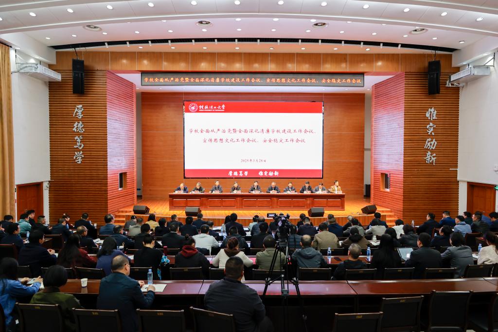 3月28日下午,学校在屏风校区召开全面从严治党暨全面深化清廉学校建设工作、宣传思想文化工作、安全稳定工作会议,贯彻落实党中央有关决策部署和自治区党委工作要求,全面总结过去一年学校相关领域工作,研究部署2025年重点任务。学校党委书记农毅出席会议并讲话,党委副书记、校长王敦球主持会议。