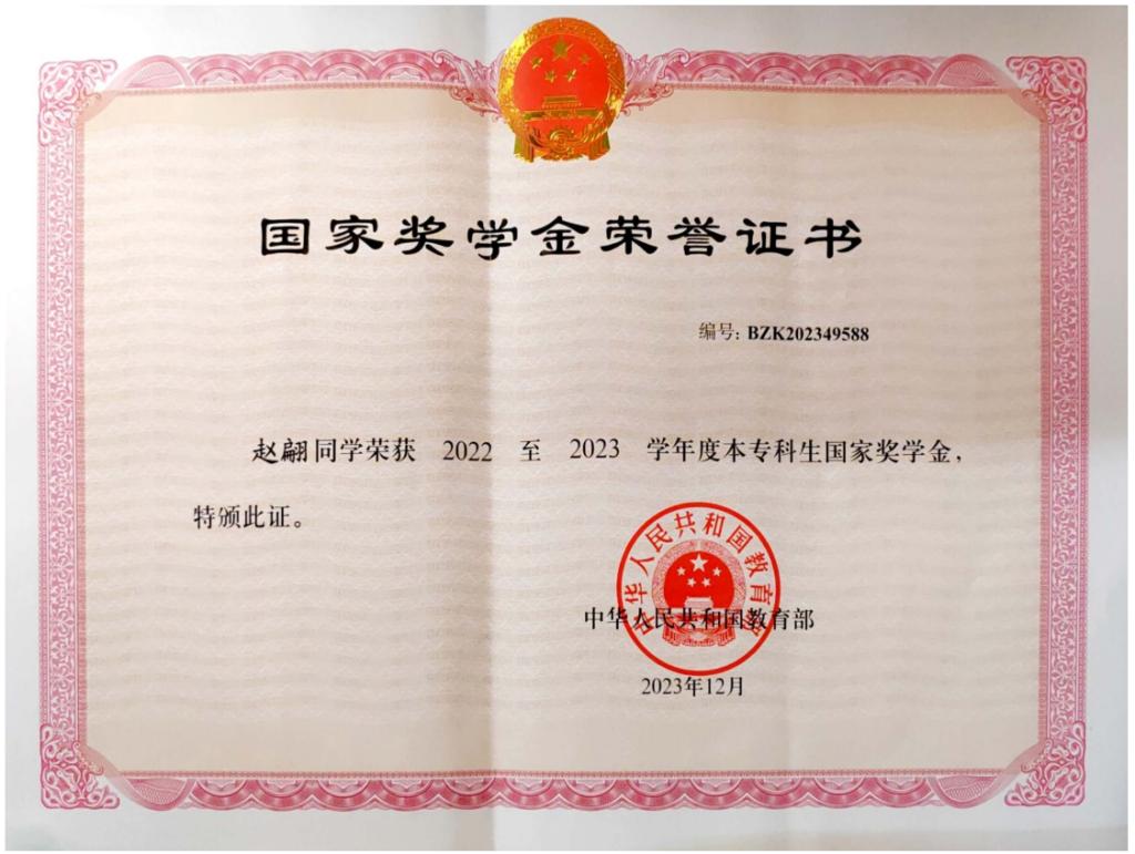 荣获2022至2023学年度本专科生国家奖学金