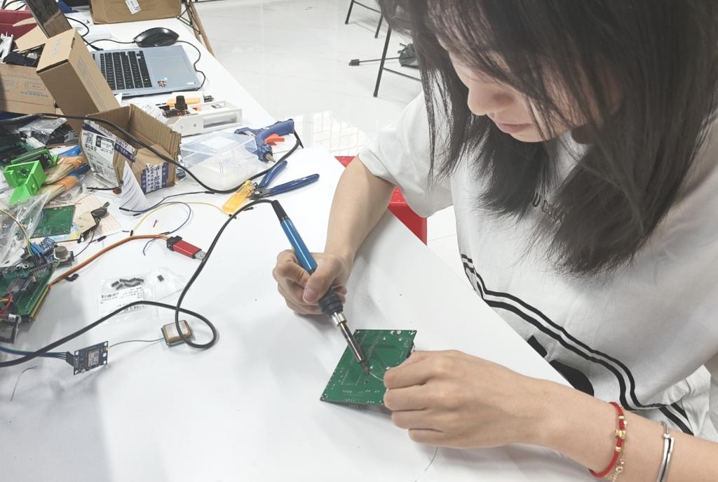 在这一项目研发过程中,赵翩个人也经历了从技术空白到突破重围的蜕变。项目初期,面对完全陌生的技术领域,她通过网课恶补单片机知识,在朋友指导下从零开始学习电路板设计与代码编写。当团队着手搭建项目成品时,机械结构失衡导致导览车频繁偏离路线,她与队友反复讨论改进方案,却始终未能突破瓶颈。