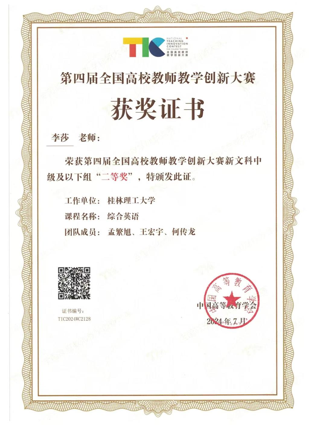 李莎老师团队获全国高校教师教学创新大赛国家级二等奖