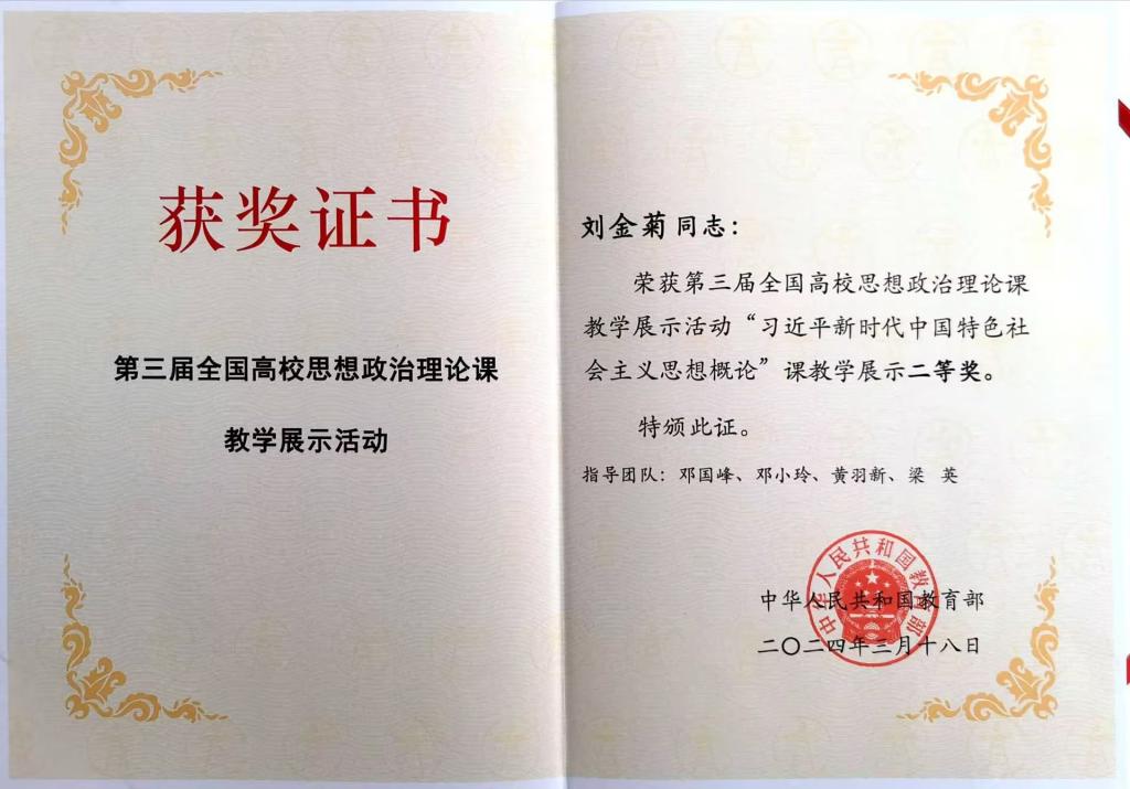 刘金菊老师荣获第三届全国高校思想政治理论课教学展示活动二等奖