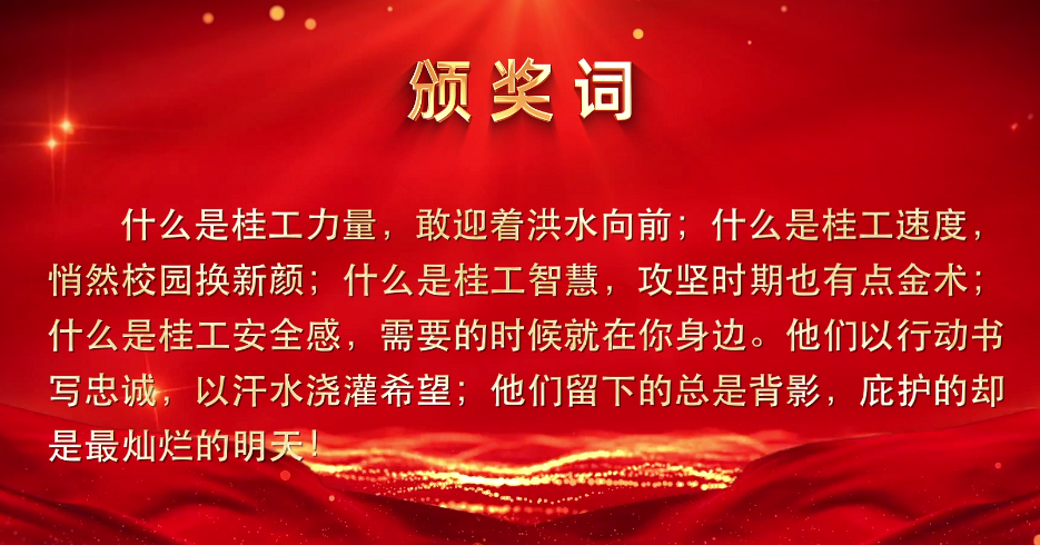 为进一步传承弘扬“桂工精神”,讲好桂工故事,传播桂工正能量,彰显桂工新担当,学校继续开展“出彩桂工·年度致敬”评选表彰活动。经过推荐、审核和遴选,最终选取13项年度致敬事件、团队和人物。本栏目主要集中展示获表彰对象先进事迹,引导全校师生共同为2024年学校取得的新成就喝彩、向每一个为理想拼搏奋斗的出彩桂工人点赞致敬、为更加幸福美好的桂工加油!