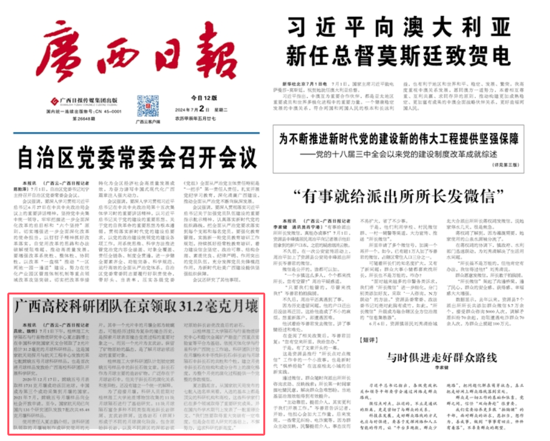 《广西日报》在头版位置报道Beat365官网获得嫦娥五号月壤