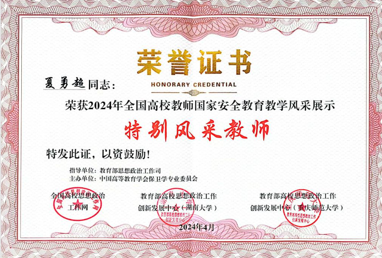 学院教师获2024年全国高校教师国家安全教育教学风采展示特别风采教师荣誉称号