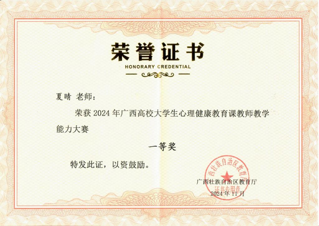 学院教师夏晴荣获2024年广西高校大学生心理健康教育课教师教学能力大赛一等奖