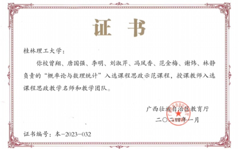 学院课程《概率论与数理统计》获得自治区级课程思政示范课
