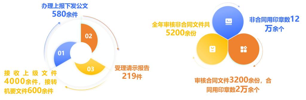 严把公文起草关,高质量起草党委三届七次全会报告、三届八次全会报告等各类文稿300余篇、200余万字,3篇办学治校特色经验信息被《广西教育信息》采用。协助自治区党委召开经济科技教育领域推动广西高质量发展座谈会,推动处级领导干部专题培训班、改革发展研讨会、新生开学典礼和毕业典礼、68周年校庆、“出彩桂工·年度致敬”等重大活动顺利开展。严格执行公文处理内控流程和要求,全年办理上报下发公文、请示报告、接转机要文件5400余件。加强规范用印管理工作,启用电子章,全年审核文件8400余份,用印14万余个。
