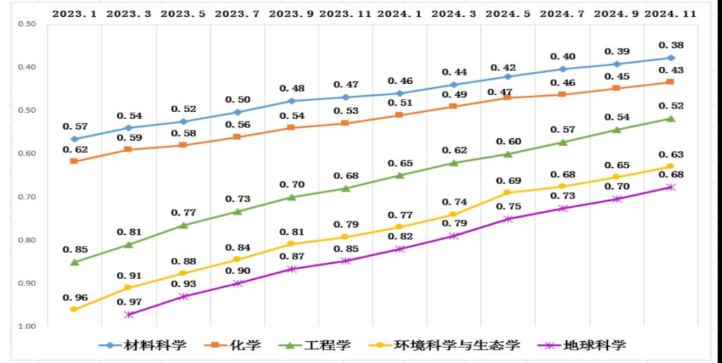 学校ESI前1%学科相对排名变化趋势图