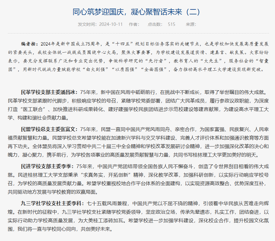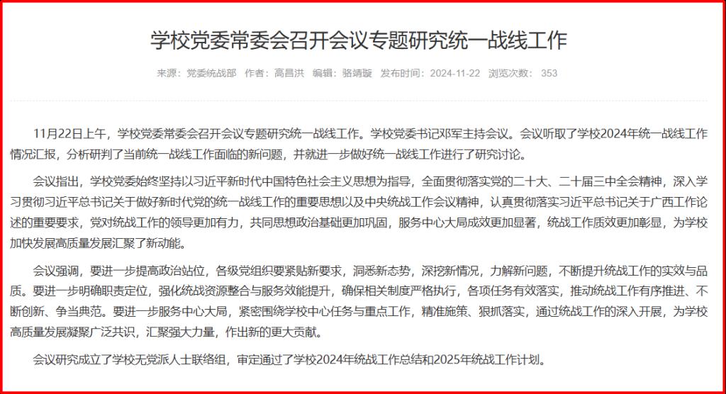 2024年,党委统战部坚持以习近平新时代中国特色社会主义思想为指导,深入学习贯彻党的二十大和二十届三中全会精神,全面贯彻落实习近平总书记关于做好新时代党的统一战线工作的重要思想,紧密围绕学校党委三届七次、八次全会战略部署,团结引领全校统一战线守正创新、担当作为,为谱写好中国式现代化的桂工篇章凝聚智慧力量。