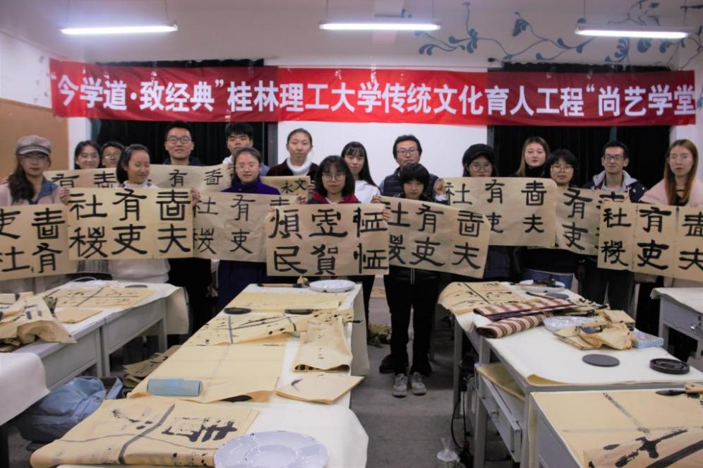 坚持以习近平新时代中国特色社会主义思想为指导,弘扬中华美育精神,以美育人、以美化人、以美培元。聚焦强化中华优秀传统文化教育,坚持用校园文化凝心铸魂。一是充分挖掘“桂工校史”和“桂工精神”内涵,创编具有桂工特色的原创文艺作品。创作桂工特色情景朗诵《相遇·桂工》,桂工特色地质主题群舞《极地》、桂工校园生活光影剧《桂工故事》等原创文艺作品10余项,激发桂工青年的爱国荣校意识。二是推动“传统文化进支部”,不断完善面向全体的美育育人机制。开设“尚茗学堂”“尚礼学堂”“尚艺学堂”等传统文化精品课程,建优剪纸协会、书法协会等传统文化社团,让学生在民族艺术体验中感受中华文化的韵味。三是依托“桂工讲坛”第二课堂“到梦空间”等平台,深化美育教育。聘请校外德艺双馨的艺术“大咖”进校开展讲座5场,开设美育类第二课堂课程50余门,吸引8000余名学生参与,让美育文化在学生中扎根。