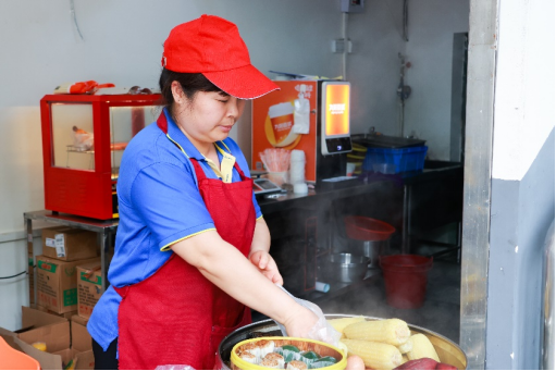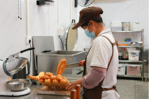 正值学生早起用餐的高峰期,食堂阿姨正有条不紊地为同学们准备早餐。狭小的工作台上,提前几小时制作包子、豆浆、鸡蛋、蒸饼……品种丰富、热气腾腾的早点已经陈列就绪。不久之后,它们将被送到同学们手中,他们忙碌的一小时,为学生做出可口的美食,灵巧的双手带来的不仅是物质上的饱满,更是劳动美的精神。