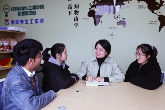 下午一点,辅导员赵思聪老师正在跟学生谈心谈话。今年是她成为辅导员的第十个年头,但她每接触新的一届学生,都会做足了解学生的功课,摸清学生的特点,有针对性地做好每一届学生的思想政治工作。她常说:“每个学生都有自己鲜明的特点,他们来自不同的地域、家庭,甚至经历不同的年代,你永远不知道下一届学生会是什么样,只有充分了解学生,才能根据不同情况采取具体的教育引导方法,帮助学生寻找真正的自己,引导学生将个人理想融入祖国事业发展之中,为未来的发展矢志奋斗。”