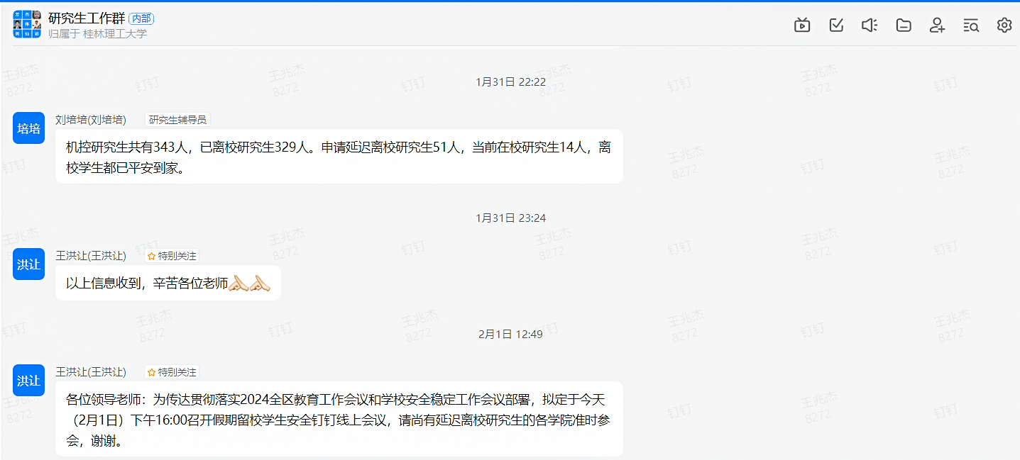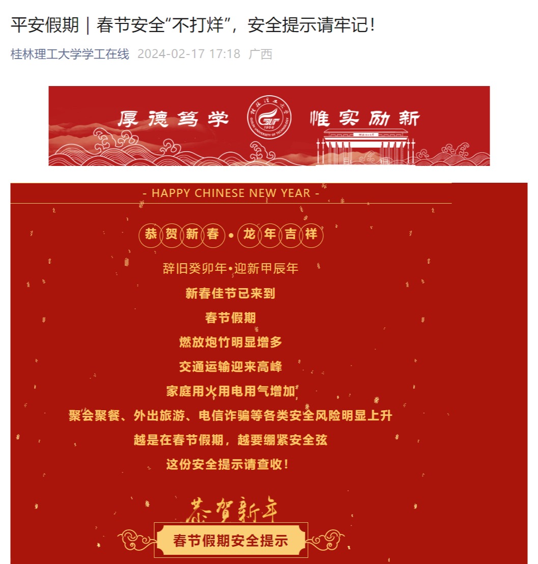 党委研究生工作部利用假期对雁山、屏风两校区研究生实验室、工作间和学生公寓进行全面安全排查,特别是在用火、用电安全方面多措并举,实行每日“零汇报”制度,确保留校研究生的人身安全得到充分保障。各单位各部门充分发挥新媒体功能,大力加强学生教育管理。学工部(处)推送《火灾再敲警钟,这些消防知识要牢记》《春节安全“不打烊”,安全提示请牢记》等假期安全知识推文多篇,增强学生安全意识,确保假期学生安全稳定。校团委聚焦重要节点打造媒体矩阵,充分发挥青年新媒体联盟作用,聚焦假期热点,抓住春节节点,紧贴工作要点,围绕校园资讯、假期安全、传统节日等,推送相关原创系列推文20余篇,阅读量达3万余人次。数学与统计学院持续向师生推送假期安全知识、专业学习、就业指导、民俗文化等内容30余篇,多措并举落实立德树人根本任务。