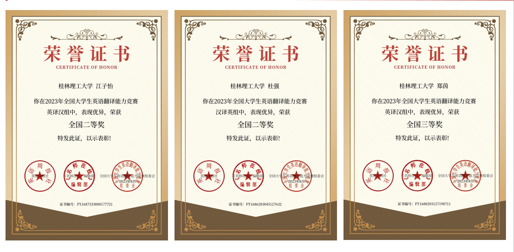 在全国大学生英语翻译能力大赛中获奖