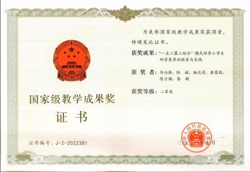 教学成果《“一主二翼三结合”模式培养小学生科学素养的探索与实践》获得国家级教学成果二等奖