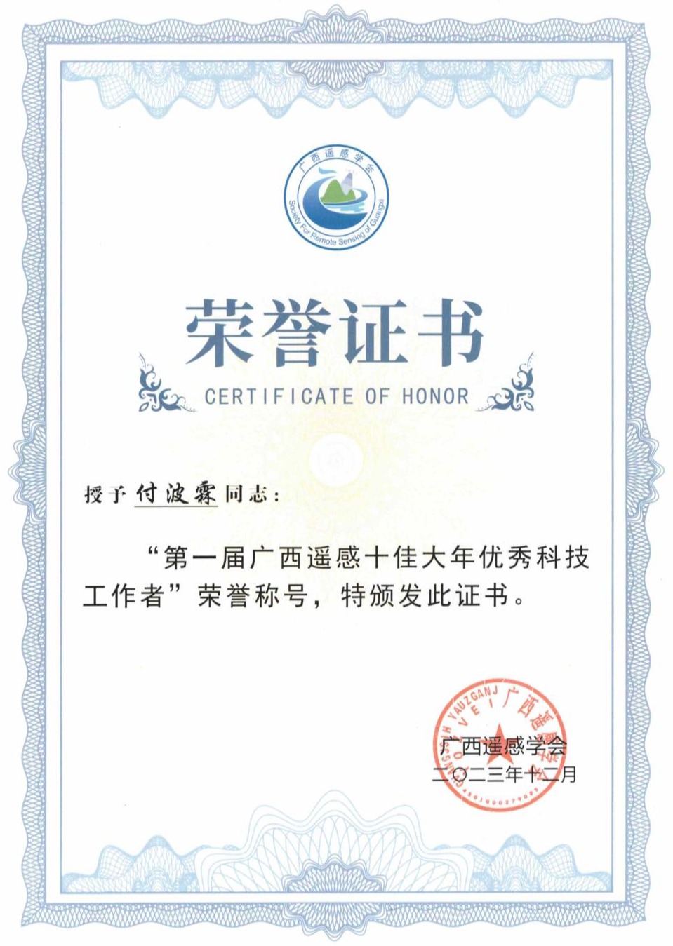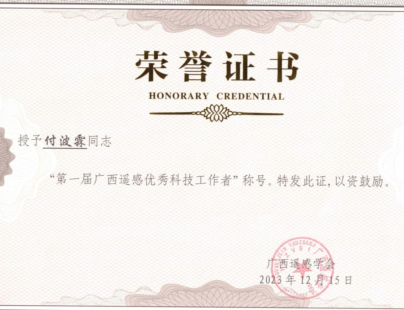 付波霖教授先后获广西遥感“十佳大年优秀科技工作者”和广西遥感“优秀科技工作者”荣誉称号