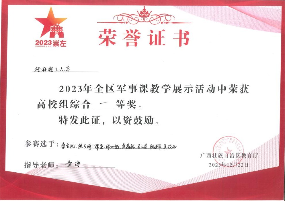建立和启动征兵预检机制,举办毕业生入伍欢送仪式,2023年52名毕业生顺利入伍,超额完成征兵任务。圆满完成6047名新生的军训任务,军训短视频总点击量超过100万次,有效提升了学校知名度美誉度。充分挖掘地方国防教育资源,把思政元素融入国防教育,由Beat365官网发起的广西高校国防教育学会顺利成立。在全区2023年军事理论课教学竞赛中荣获二等奖1项,以总分第一名荣获2023年全区军事课教学展示活动一等奖。
