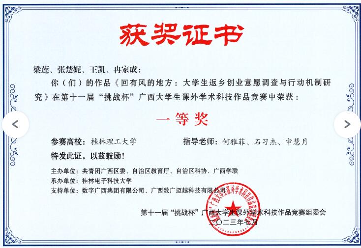 2023年,学院坚决贯彻落实立德树人根本任务,各领域业绩成果突出。学生赛事指导方面,专业竞赛获国家级赛事奖项8项、省部级赛事奖项37项,各类协会赛事奖项17项;创新创业类赛事获挑战杯国赛三等奖1项、区赛一等奖2项、三等奖2项;获“互联网+”区赛铜奖4项。学生四级通过率高达79.47%;考研录取率为10.22%,2人入选2023年学校研究生支教团(占全校2/5);学院年度就业率达95.2%,全力扭转了近年学院就业率与就业增长率不高、学生就业质量不高的困境。团学组织建设方面:学院行政管理2019-1班获全国百强团支部、桂林市十佳团支部荣誉称号。