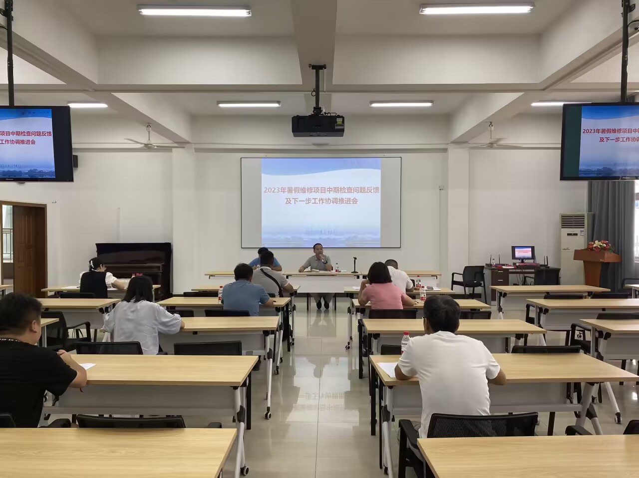 7月7日的期末工作布置会上,基建后勤处班子成员将假期基建和维修工作任务分块包干,责任到人。教职工每人认领2-3项工作任务,现场倒排工期并抓好落实。