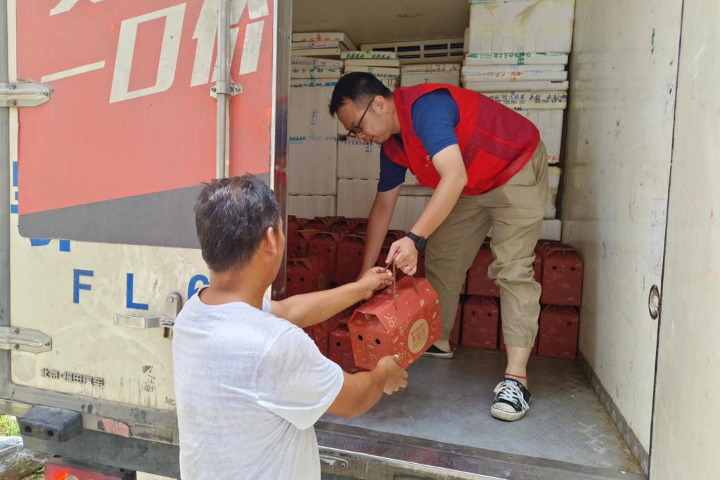 永富村第一书记杨剑与种植户一同将统一包装的水果装车发货