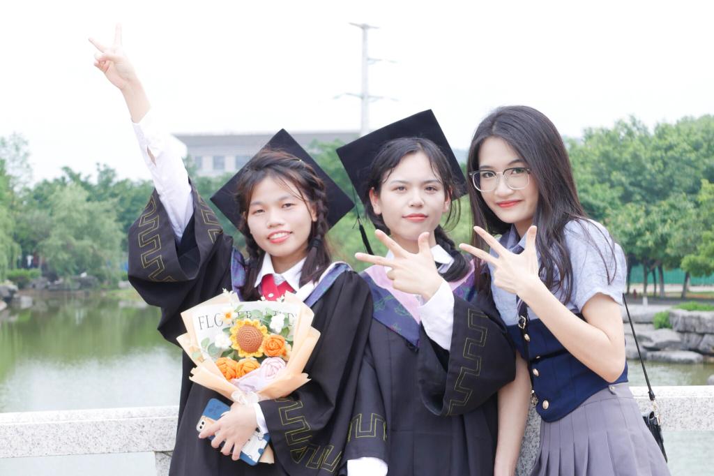 外国语学院英语专业2023届毕业生苏容莹、李格妹与日语专业20-2班张碧芸学妹:毕业前,我和鸿雁桥合个照