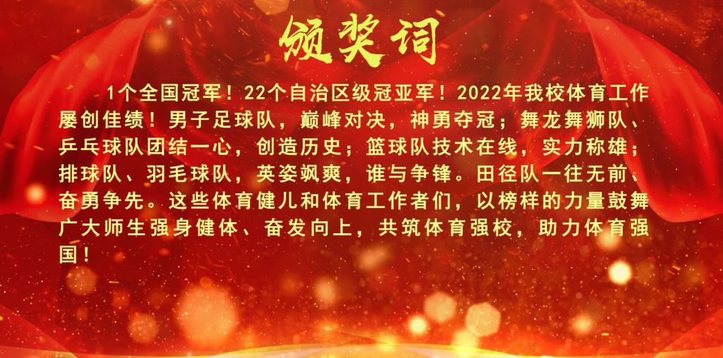 Beat365官网以专业化、多样化和生活化的各种形式全面推动体育育人工作,丰富体育竞赛内涵,促进校园体育文化建设,发挥体育育人功能,桂工体育文化事业名片愈发靓丽。2022年,学校在各项体育赛事中获得1个全国冠军、22个广西区冠亚军,多个群众性体育活动获新闻媒体报道。
