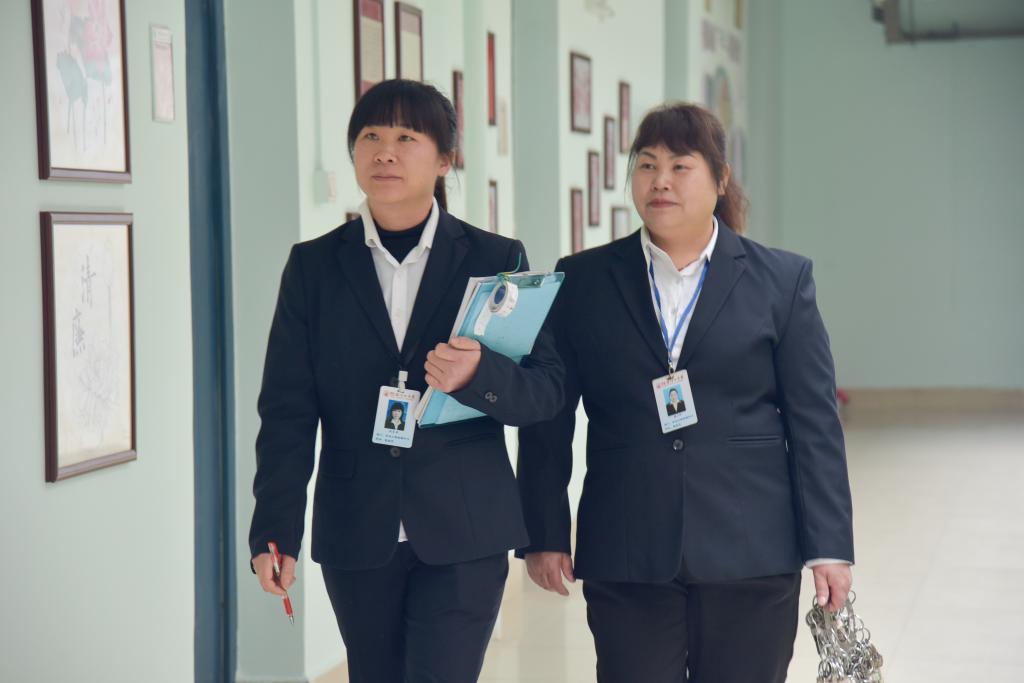 宿管唐小玲阿姨和赵志英阿姨在一同巡逻宿舍