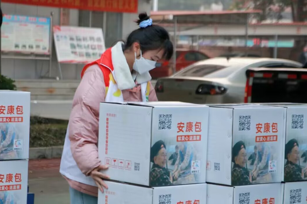 周思羽同学参与当地民政局为老人发放“安康包”志愿服务活动