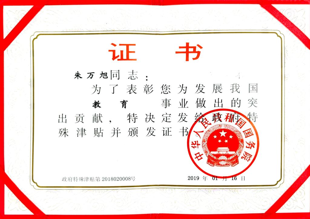 学院朱万旭教授获国务院特殊津贴