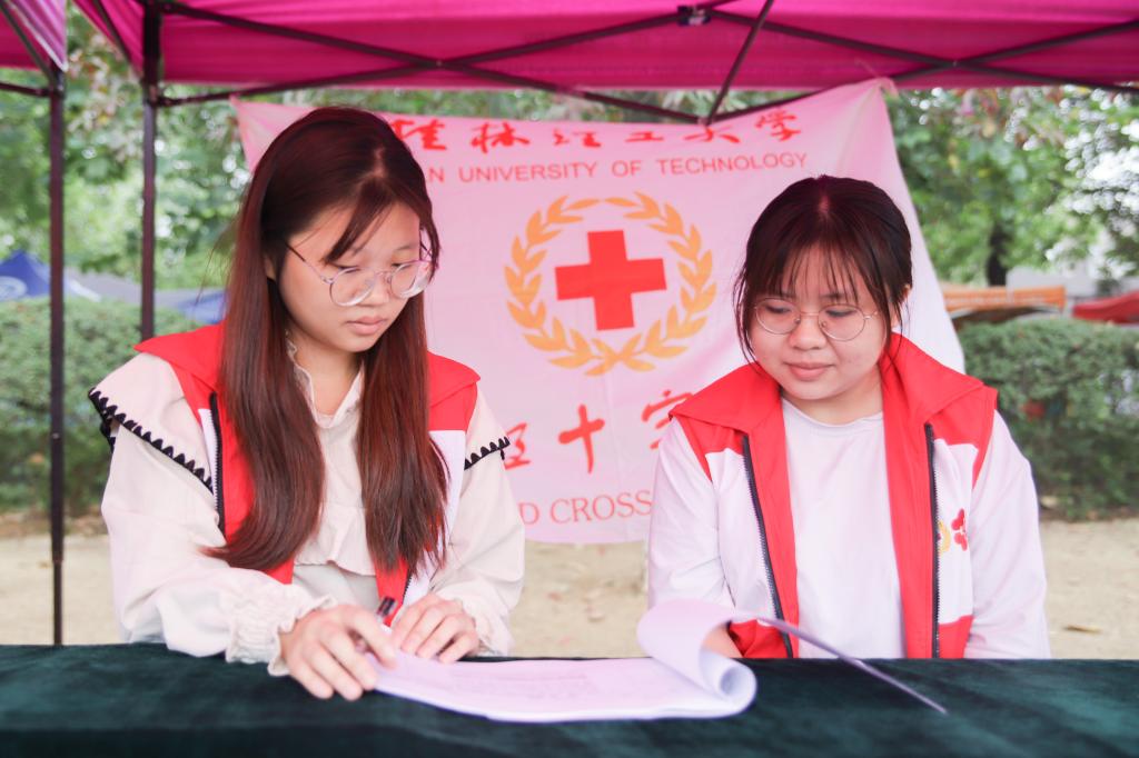 红衣披肩,后勤保障。外国语学院日语专业20-3班的韦入源作为红十字协会的志愿者,随时准备为运动健儿们提供各种帮助,协助校医做好医疗工作。她们始终坚守在自己的岗位上,贴心服务,争做校运会坚实的后盾。