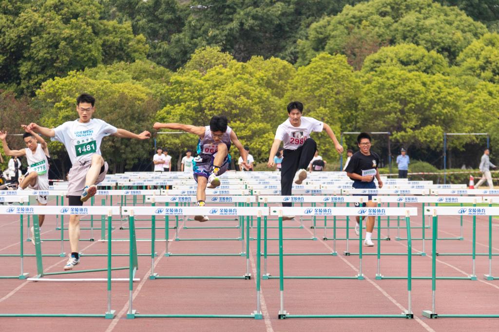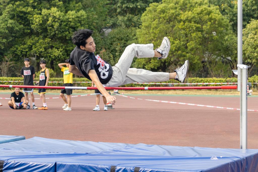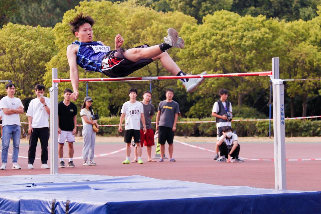 田赛场上,跳高运动员们一跃而起,矫健的身姿如鱼潜水般自信,又似鸟翱翔般轻盈,在空中划出一道道美丽的弧线,他们在跳高中感受着拼搏与快乐。