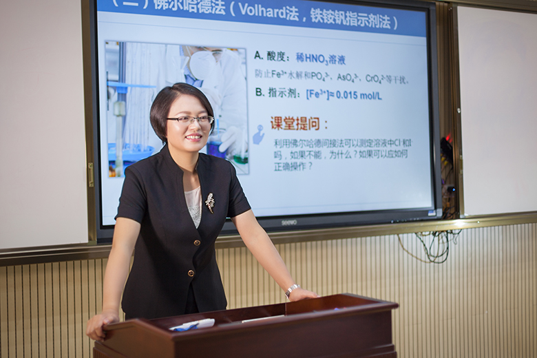 为满足学生的共性要求和个性化发展,聂瑾芳老师带领分析化学课程教学团队积极探索并实践智慧教学、翻转课堂、混合式教学等新型教学模式。聂老师提到,她早在很久以前就已经接触到了“MOOC”(慕课)的概念。在她看来,MOOC不像以前的多媒体只是一种教学技术的改革,而是整个教学理念和教学形式的大变革,是未来教育的一个大方向。在这样的想法下,聂老师开始积极参加教学研讨会、慕课教师培训、教学法集中训练营以及清华大学名师课堂随堂听课等,通过一点一点摸索,踩着石头过河,聂老师逐渐完善分析化学课程的建设,并结合在线开放课程,尝试运用雨课堂智慧教学工具开展智慧教学,创新性提出递进式OPPOs混合式智慧教学新方法,逐步建成了3门MOOC。其中分析化学课程先后被认定为校级创新创业教育改革示范建设课程和优质示范课程以及自治区线上线下混合式一流本科课程;分析化学课件被教育部在线教育研究中心评为智慧教学“雨课件”;分析化学MOOC被认定为国家首批线上一流本科课程;分析化学国际MOOC作为广西首门国际慕课,面向全世界各国大学生和社会学习者免费开放。
