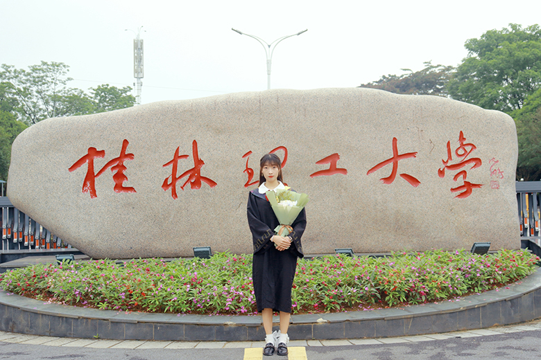 环境科学与工程学院水文与水资源工程专业2022届毕业生王蓉:毕业前,我与桂工校门合个影。