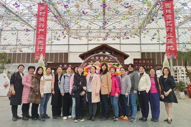 女教职工在花卉基地前合影留念