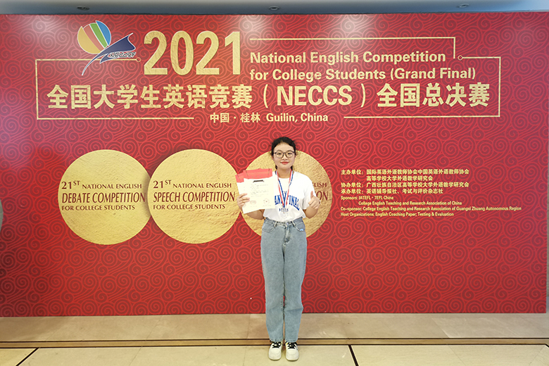 谈及专业课的学习,她说:“我们需要脚踏实地,多加思考,主动去了解、关注各个高校的学科动态和当下学科的发展前沿,才能形成对知识的深入理解。”基于对英语的热爱,她还积极参加各项竞赛,曾获广西区翻译大赛一等奖,并考取了国际人才英语证书。