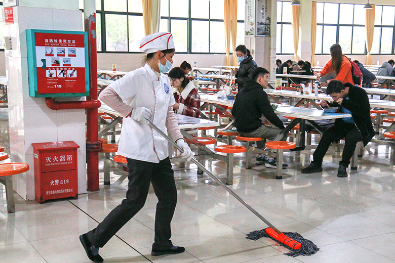 食堂地面在阿姨打扫后光洁如镜