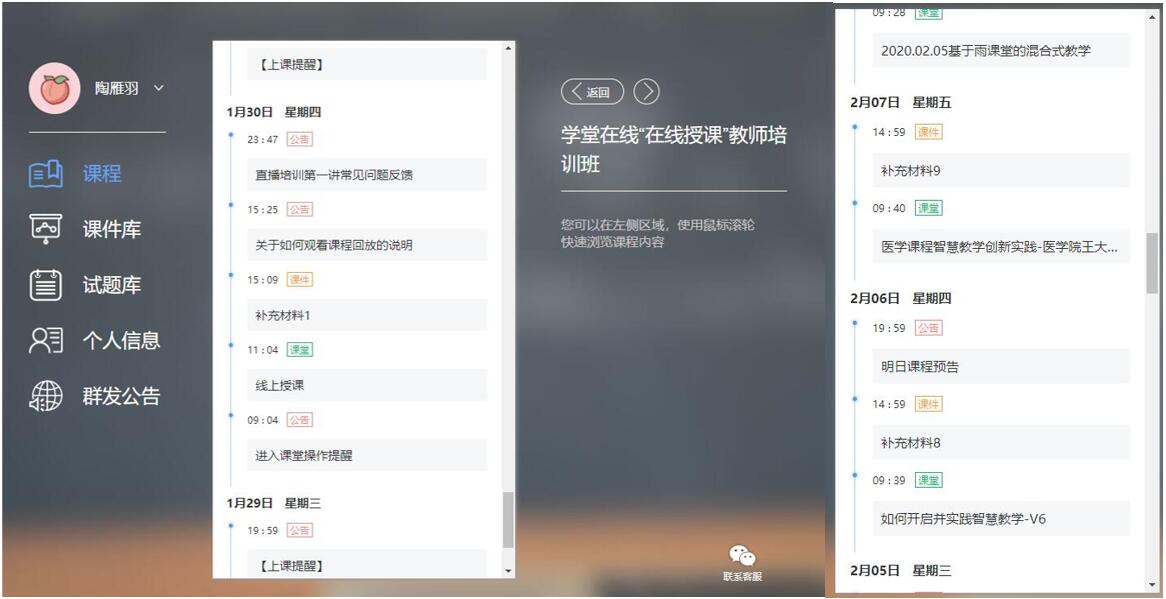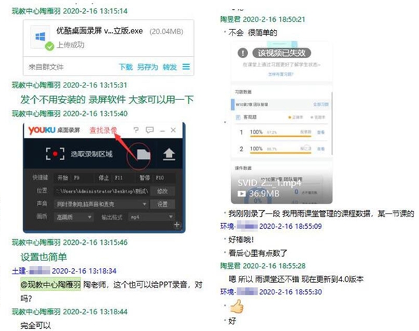 尽管群里会有重复的问题,但陶老师也会很耐心的一一回答。“虽然对于我来说已经回答过很多遍了,但是对于那位老师来说就是第一次发问,那他一定是希望得到直接回复的。确实有忙起来顾不上的情况,我会在晚上睡前回看群里消息再单独给他们留言解答,不过不能第一时间回复,这确实是个问题。”最忙的时候,一天有将近60位老师单独咨询陶老师,陶老师都对他们“一对一”的做了技术指导交流,包括操作答疑,雨课堂的后台数据维护,线上教学模式预案推荐,疫情期间授课感悟心得交流等等。