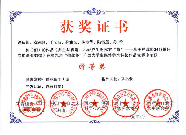 以赛促学,实践育人成果显著。组织多层次系列数学竞赛,参加学生累计达3000余人次,获国家级奖励6项,广西区级奖励70余项。在“挑战杯”“互联网+”等科技赛事中,获全国三等奖1项,区级银奖1项,铜奖2项。社会实践方面,2018年获评全国社会实践优秀团队,2019年获得区级立项1项,获团中央立项1项,实践成果入围“千校千项”精彩作品遴选。