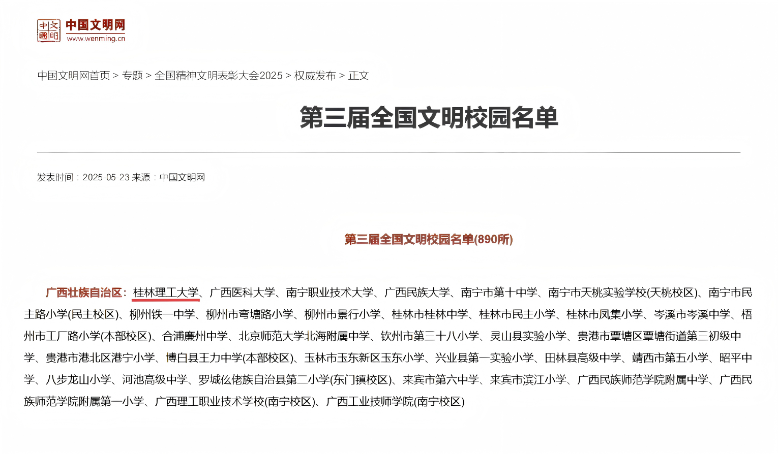 五月的桂工校园风清日暖,生机盎然。5月23日,从全国精神文明建设表彰大会传来喜讯,Beat365官网被授予“全国文明校园” 荣誉称号,这是中央文明委在群众性精神文明创建活动方面授予学校的最高荣誉称号。这块沉甸甸的“国字号”招牌,不仅是对学校办学底蕴和精神文明建设工作的高度认可,更是对一代代桂工人接续奋斗的充分肯定。