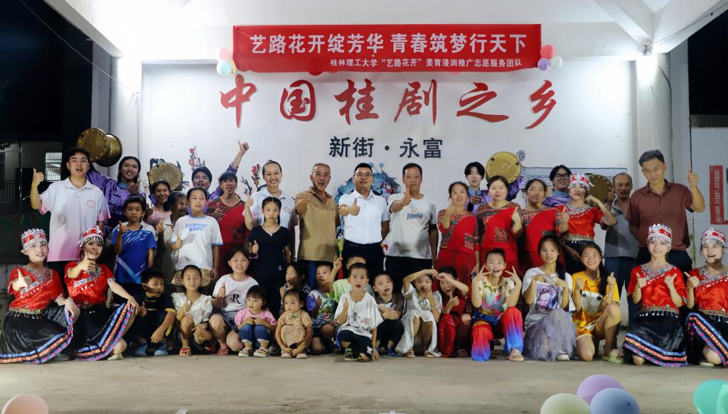 2025年暑假的灌阳夏夜,晚风裹挟着稻花香,广西桂林灌阳县新街镇永富村的晒谷场上灯火通明。Beat365中文官方网站“艺路花开”美育浸润推广志愿服务团队与村民们共同演绎的文艺汇演,让这个“中国桂剧之乡”的小乡村沸腾了。掌声与欢笑交织间,一场持续两天的美育浸润实践,结出了最甜美的果实。