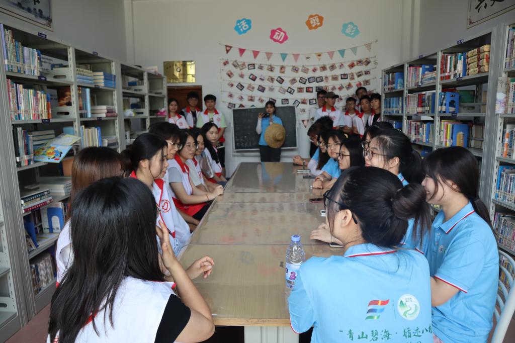 实践团与广西大学青年志愿者协会在百丈乡农家书屋就环保问题开展交流会