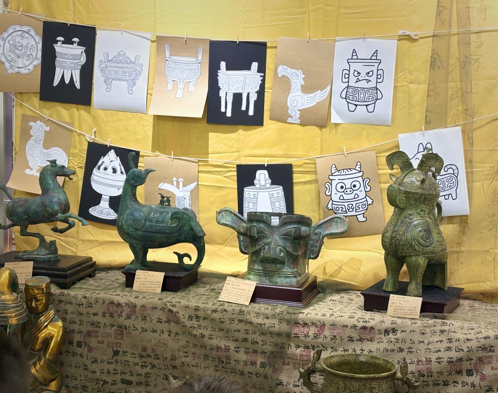 队员精心布置的青铜器(1:1复制件)实物展台供小朋友观看学习