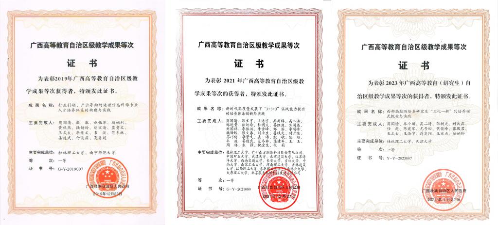 团队坚持教授到一线为本科生授课,并将教学科研成果转化为优质教育资源,持续推进教学改革,培养面向西南地区大型工程、自然资源测绘等测绘类人才。团队拥有广西空间信息与测绘重点实验室、李德仁院士工作站、广西测绘激光雷达智能装备科技成果转化中试基地等11个省部级教研平台,2个军民融合创新实验室,依托自治区高校“三全育人”综合改革示范校院系、自治区高校课程思政示范基层教学组织,打磨获评了多门省部级公开课、示范课、一流课程等。依托平陆运河等重大工程搭建测绘实践基地,主动融入行业和区域经济发展格局,建立了本科-硕士-博士贯通式的人才培养体系。近五年,获广西高等教育教学成果特等奖1项、一等奖4项,指导学生获“互联网+”大学生创新创业大赛全国银奖等省部级以上奖励112项。